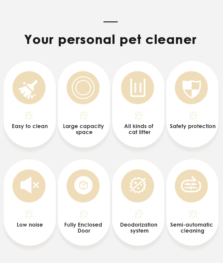 | Siffofin | Semi-Automatic Modern Design Akwatin KatiZayyana Zagaye, Ƙofar da aka rufe, tana hana yaduwar wari a zahiri. 10L Babban kwandon shara Mai jituwa tare da kowane nau'in zuriyar cat. Ana iya cirewa kuma mai wankewa.A cikin keɓantaccen ƙirar ƙirar ƙira, yana da sauƙin warwatse kuma duk sassa ana iya wanke shi. |